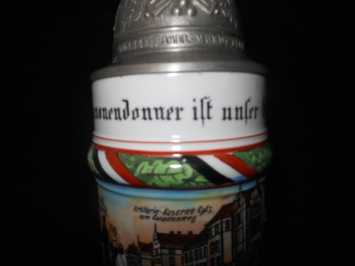 You are bidding on a VERY NICE example of a WW1 Imperial Prussian Military Reservists Regimental Stein! This once belonged to a member of 2. Battr 1 Westf. Feldart Rgt. No 7 Wesel!