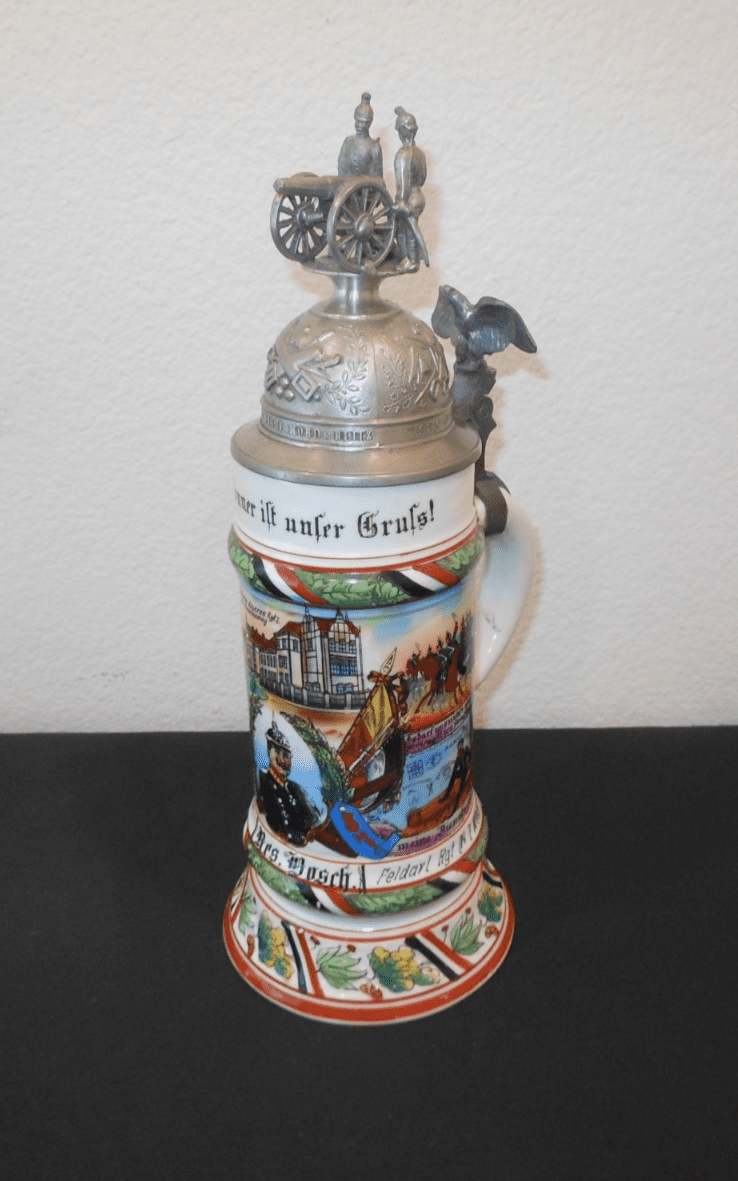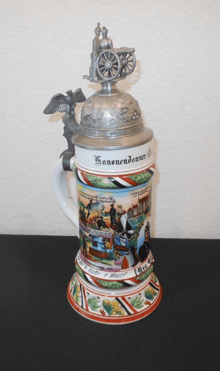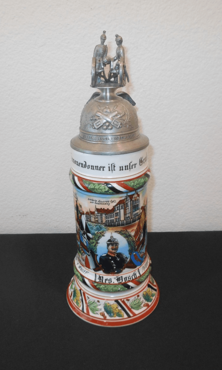 Made of ceramic and pewter, this Reservist’s Stein is an AMAZING example! Circa 1904, it is 1/2 Liter in size, and features a