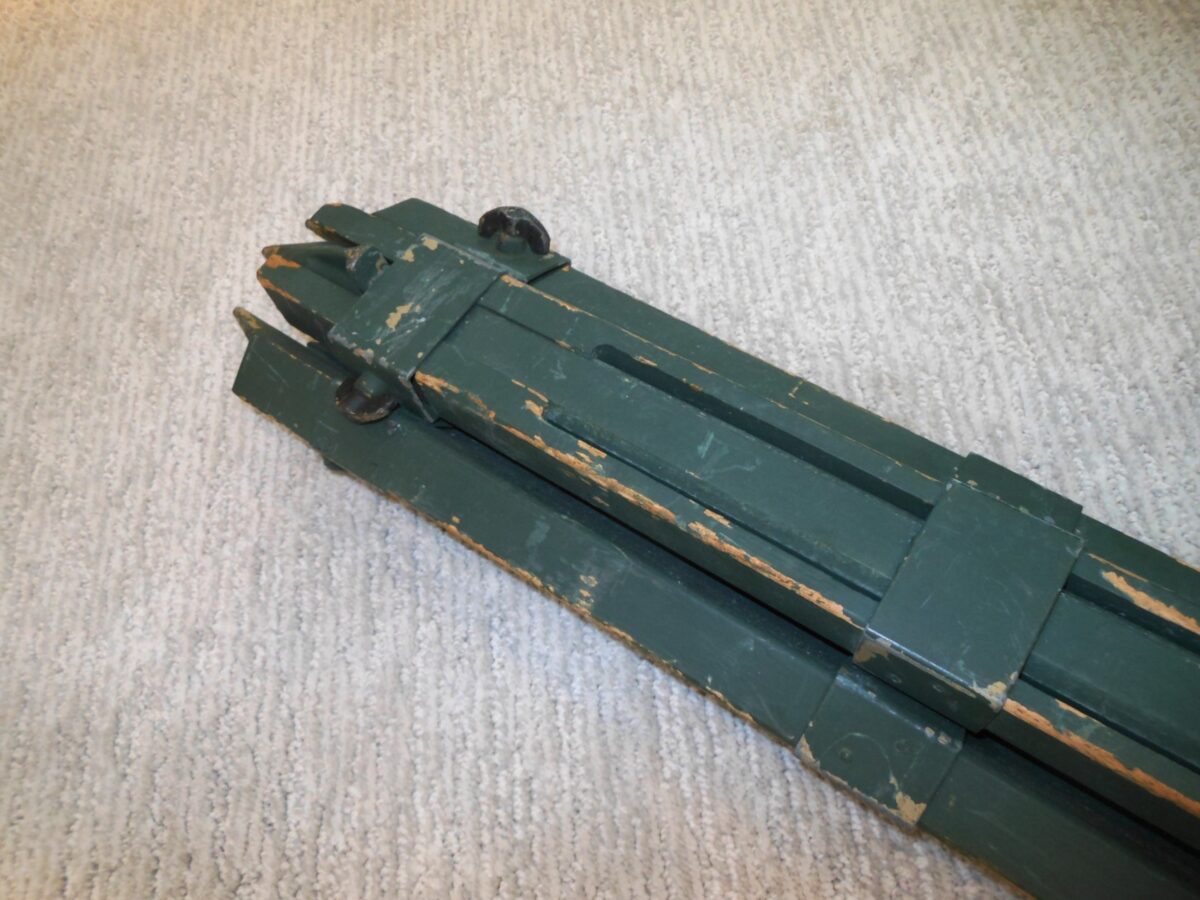 Made of wood and steel by “cme” (Gebr. Wichmann, Berlin), this aiming periscope tripod was manufactured between 1943 and 1945. Though some of the RARE Dunkelgelb Tan paint can be seen, it was repainted by Finland during the war (should be easy to remove). All adjustments work perfectly, and there are NO breaks or damage! Interesting that the main knob is made of brass (probably to save on aluminum). I have shown this EXACT style of tripod in use in the last image. A VERY RARE item, it would make a PERFECT addition to any collection or display!